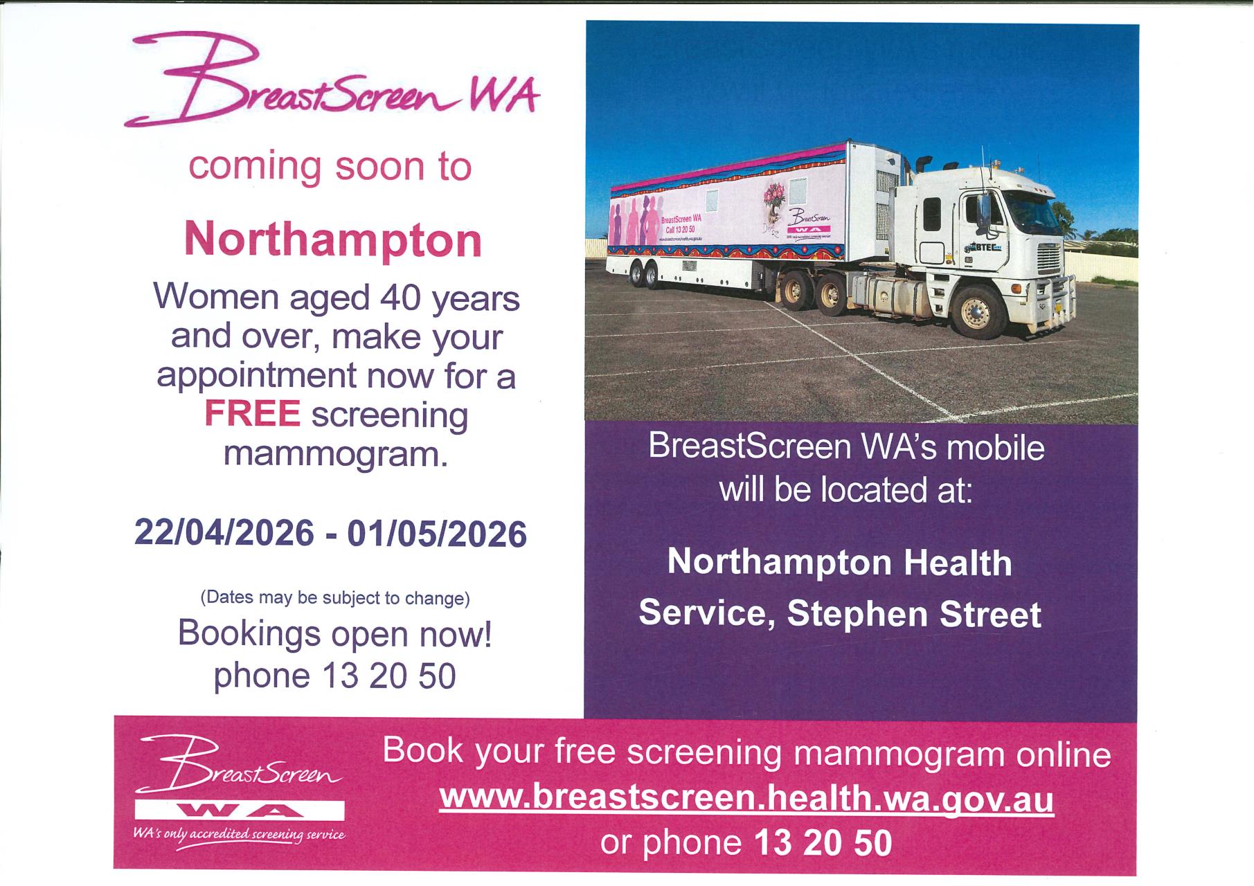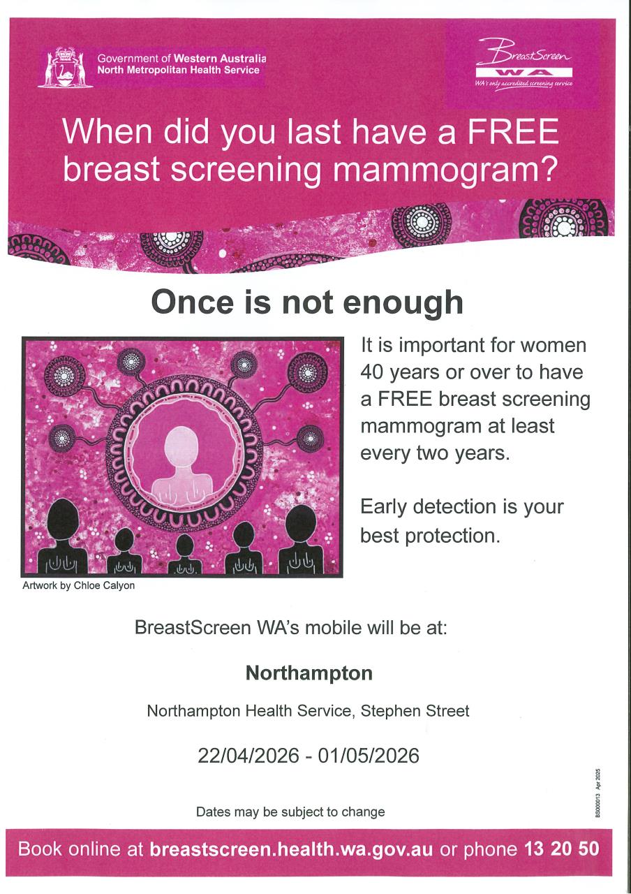 Latest News 24-03-2026 POTENTIAL SEVERE WEATHER IMPACTS FROM EX TROPICAL CYCLONE NARELLE Read More 24-03-2026 BreastScreen WA in Northampton Read More 24-03-2026 Public Notice - Disposal of Lot 6 (No. 78) Robinson Street, Northampton Read More 23-03-2026 Employment Opportunity - Kalbarri Refuse Supervisor Read More 19-03-2026 Community Consultation - Proposed Speed Limit Change George Grey Drive & Red Bluff Road Read More