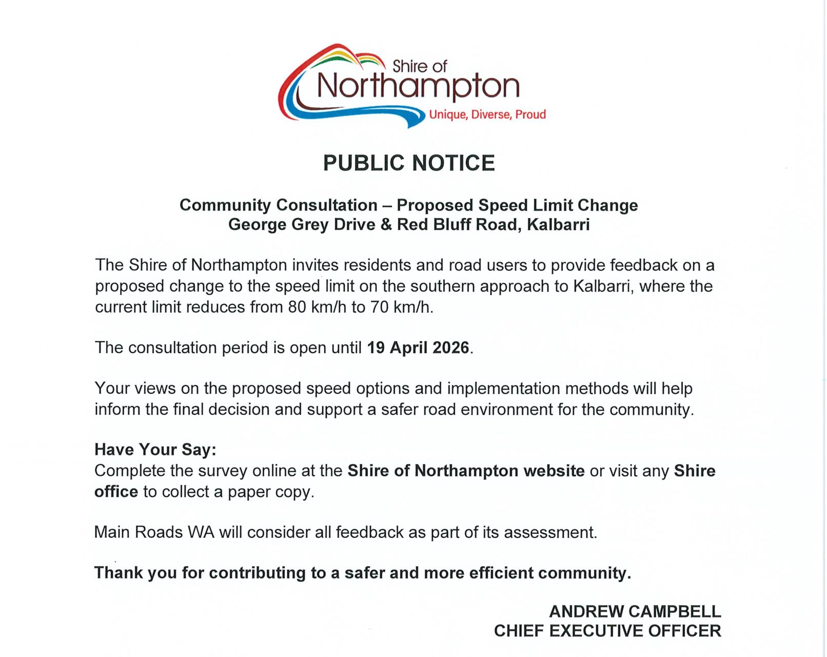 Community Consultation - Proposed Speed Limit Change George Grey Drive & Red Bluff Road Published on Thursday, 19 March 2026 at 1:45:44 PM Please clink on the link below to download the Questionnaire. Community_Consultation_Speed_Zone_Change_-_Kalbarri_.pdf Back to All News
