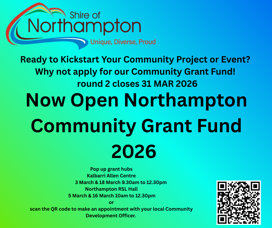 Latest News 27-02-2026 Community Grant Fund Round 2 Open Read More 27-02-2026 Story Harvest - Echoes of the Past Event Read More 27-02-2026 Media Release - Joint Community Emergency Services Manager appointed Read More 25-02-2026 Advice of Public Works Eco Flora and Capital Hill Kalbarri Read More 11-02-2026 Positions Vacant Closing 27 February 2026 Read More