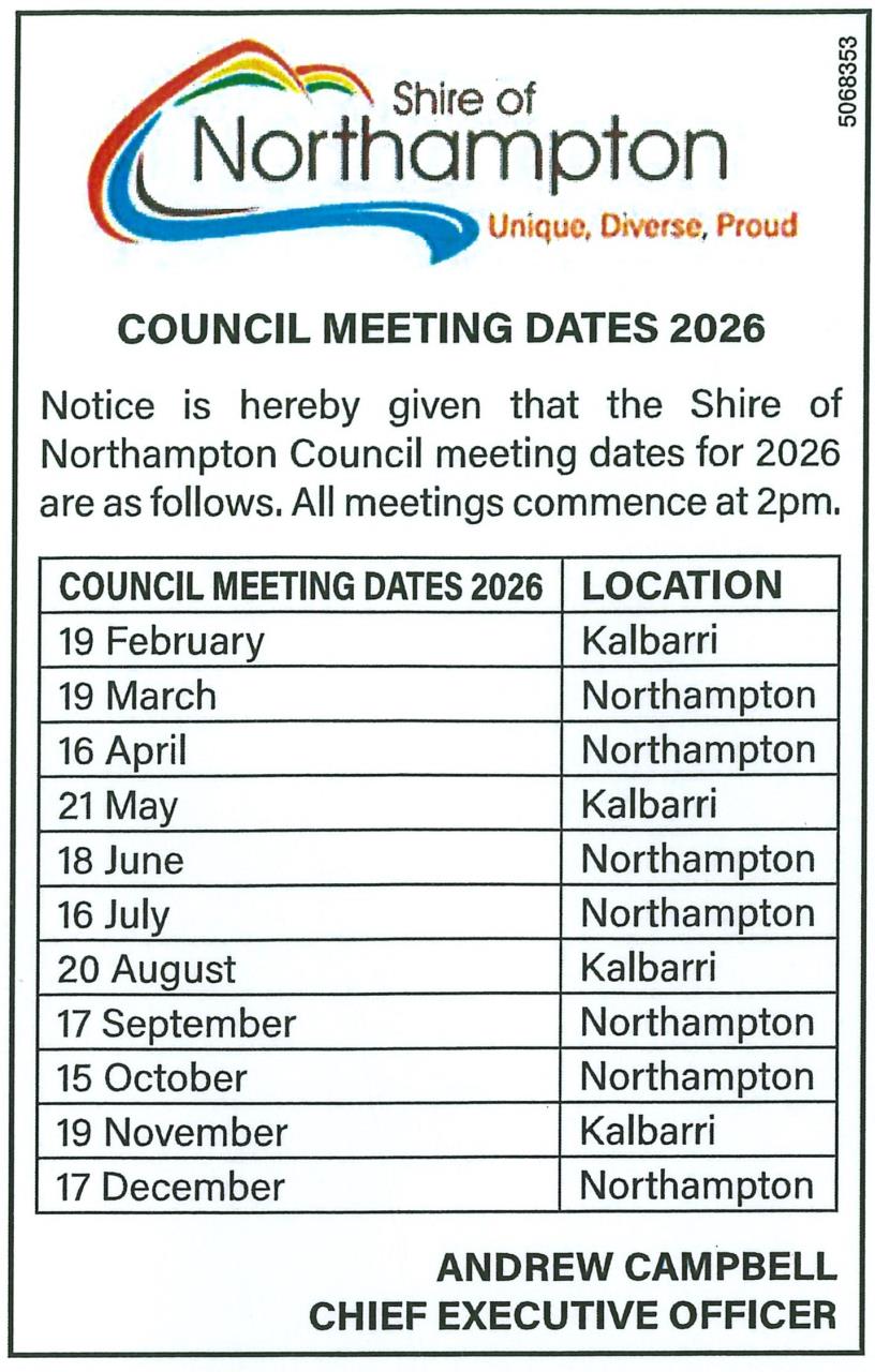 Latest News 12-01-2026 Notice of 2024-25 Annual Electors Meeting Read More 12-01-2026 Council Meeting Dates 2026 Read More 09-01-2026 Position Vacant - Kalbarri Refuse Supervisor Read More 09-01-2026 Call 000 Read More 27-11-2025 Employment Opportunity - Community Emergency Services Manager Read More