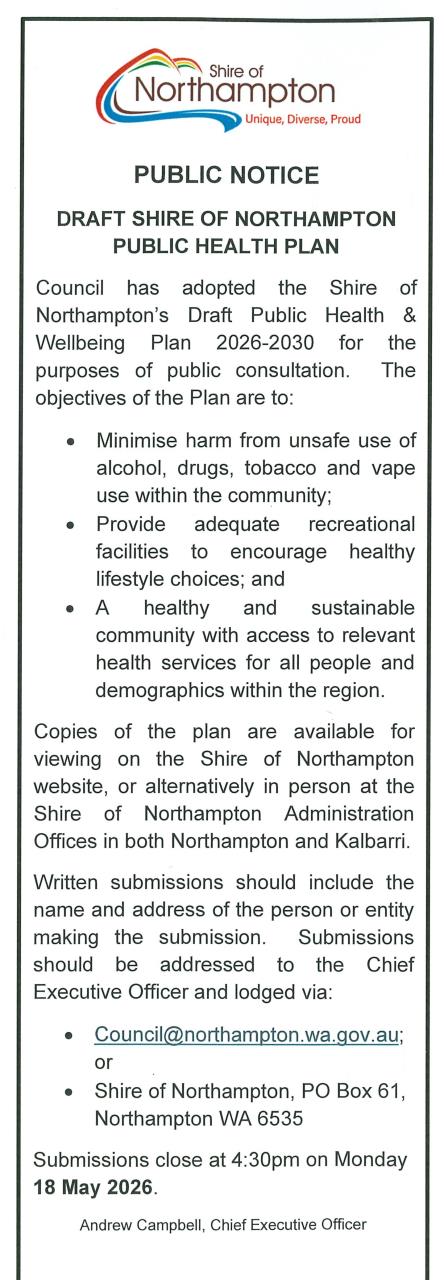 Draft Shire of Northampton Public Health Plan Published on Wednesday, 18 March 2026 at 10:34:14 AM Back to All News