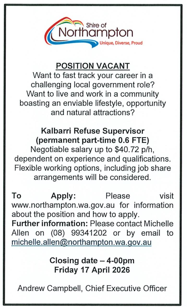 Employment Opportunity - Kalbarri Refuse Supervisor Published on Monday, 23 March 2026 at 9:59:15 AM Please click on link below to view Position Description; PD_Kalbarri_Refuse_Supervisor__EMCDR_.pdf Please click on link below to download the Application Package; Employment_Application_Pack__Kalbarri_Refuse_Supervisor__-Apr_2026_.pdf Back to All News