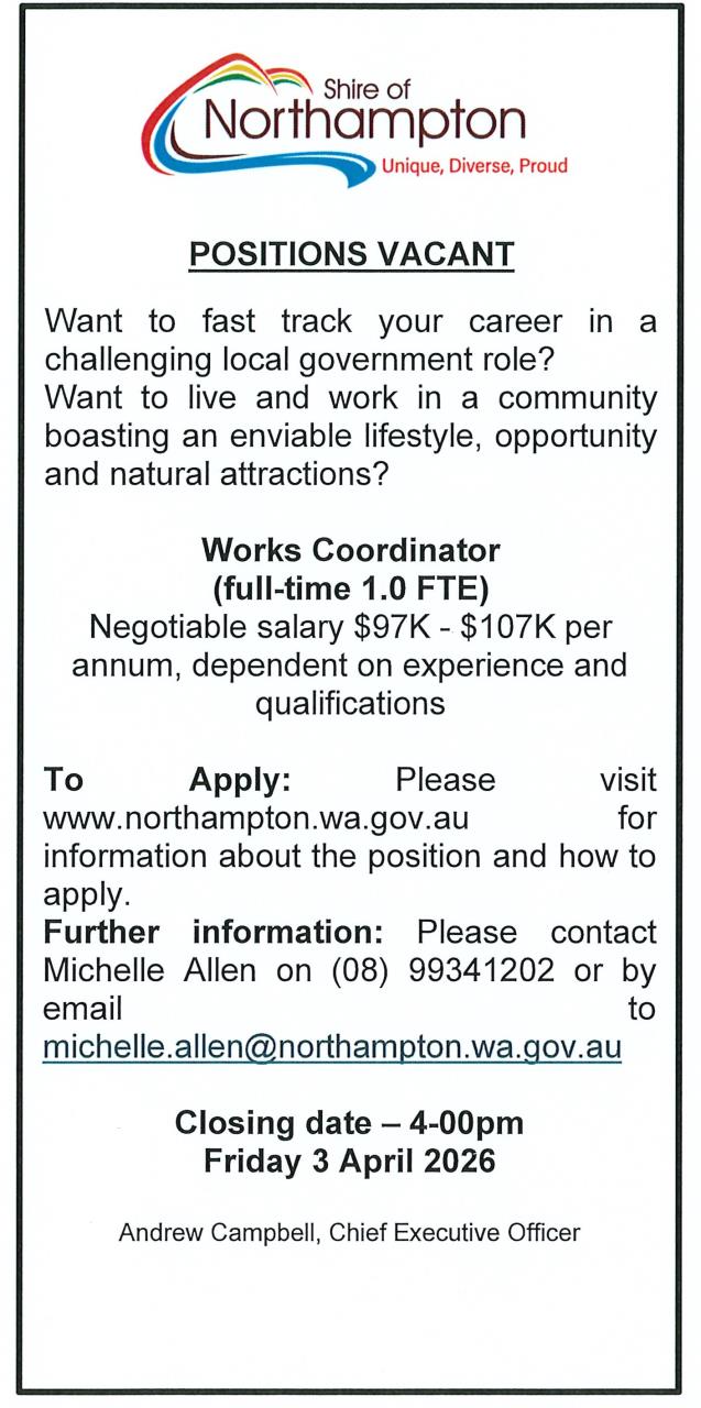Employment Opportunity - Works Coordinator Published on Tuesday, 10 March 2026 at 10:37:09 AM Please click on link below to download Position Description: PD_Works_Coordinator_-__EMWTS__Feb_2026.pdf Please click on link below to download Application Package: Employment_Application_Pack__Works_Coordinator_-_Northampton__-Mar_2026.pdf Back to All News