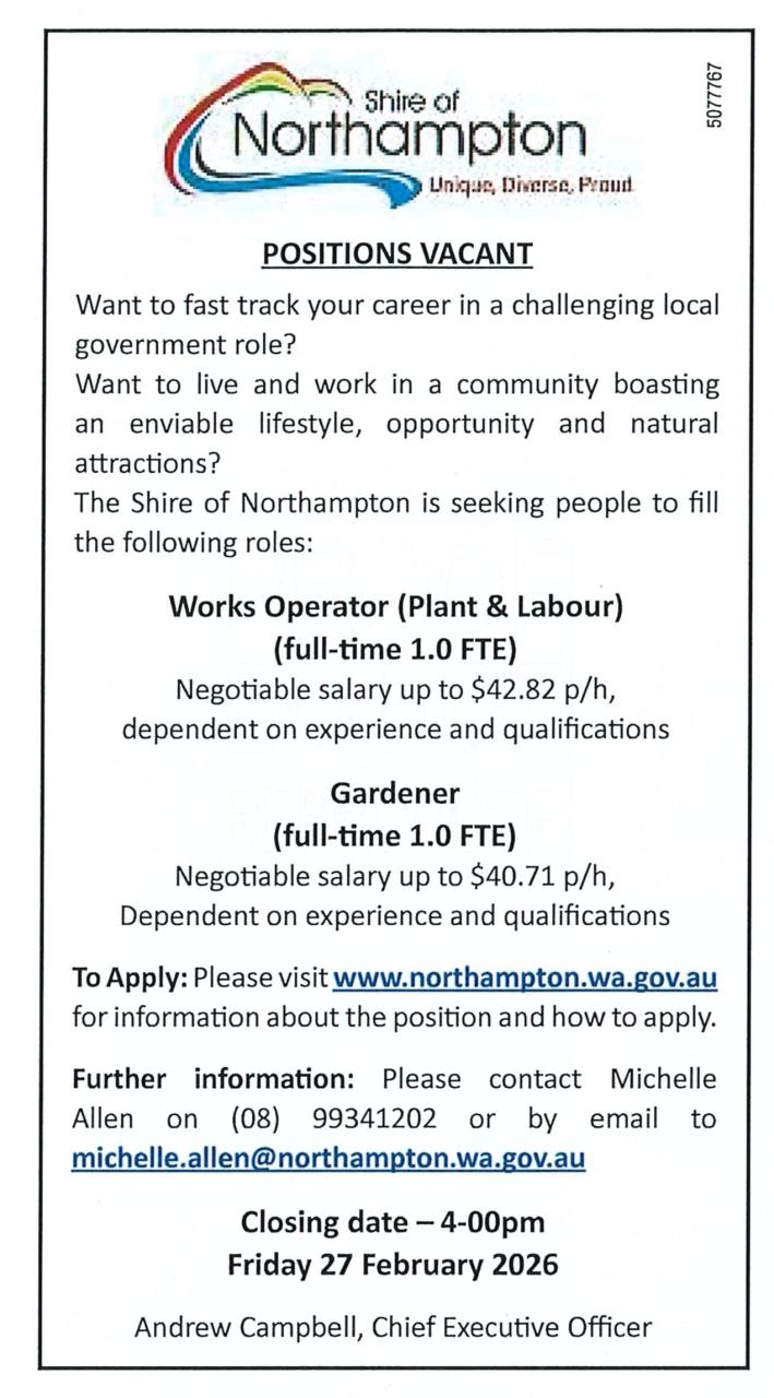 Positions Vacant Closing 27 February 2026 Published on Wednesday, 11 February 2026 at 3:01:41 PM Clink on the links below to download the Position Descriptions PD_Gardener_-__EMWTS_.pdf PD_Works_Operator-Plant__Labour_-__EMWTS__.pdf Clink on the links below to download the Employment Packages Employment_Application_Pack__Gardener_-_Northampton__-_Feb2026.pdf Employment_Application_Pack__Works_Operator_-_Northampton.pdf Back to All News
