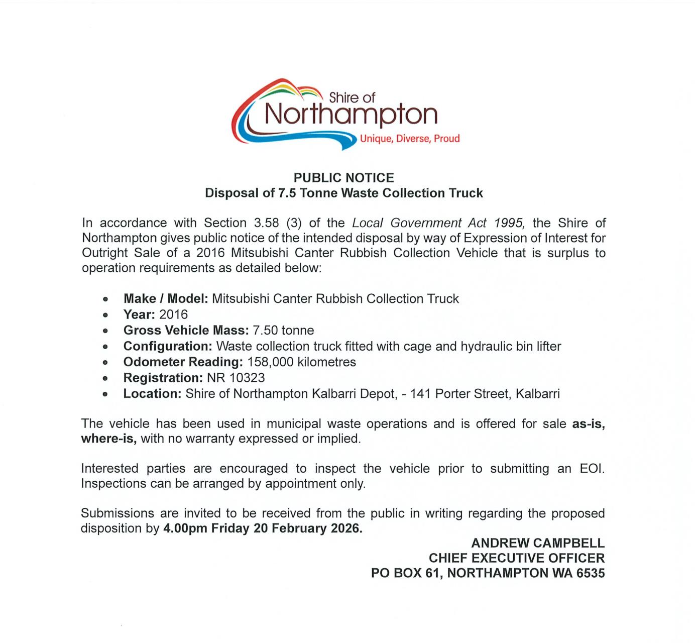 Latest News 28-01-2026 Public Notice - Disposal of 7.50 Tonne Waste Collection Truck Read More 15-01-2026 Public Notice - Disposal of Lot 29 (No. 2) Rake Place, Northampton Read More 15-01-2026 Public Notice - Disposal of Lot 22 (No. 1) Rake Place, Northampton Read More 14-01-2026 Recycling Regatta in Kalbarri Read More 14-01-2026 Australia Day 2026 in Kalbarri Read More