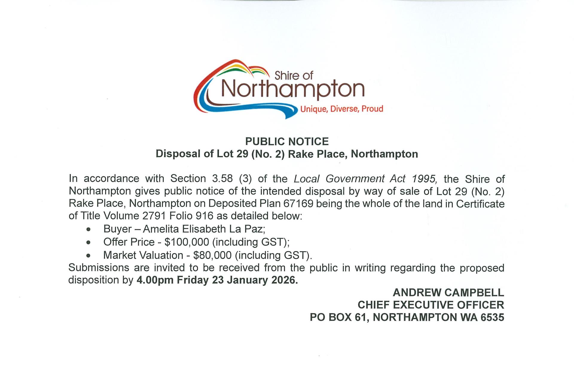 Public Notice - Disposal of Lot 29 (No. 2) Rake Place, Northampton Published on Thursday, 15 January 2026 at 7:55:42 AM Back to All News