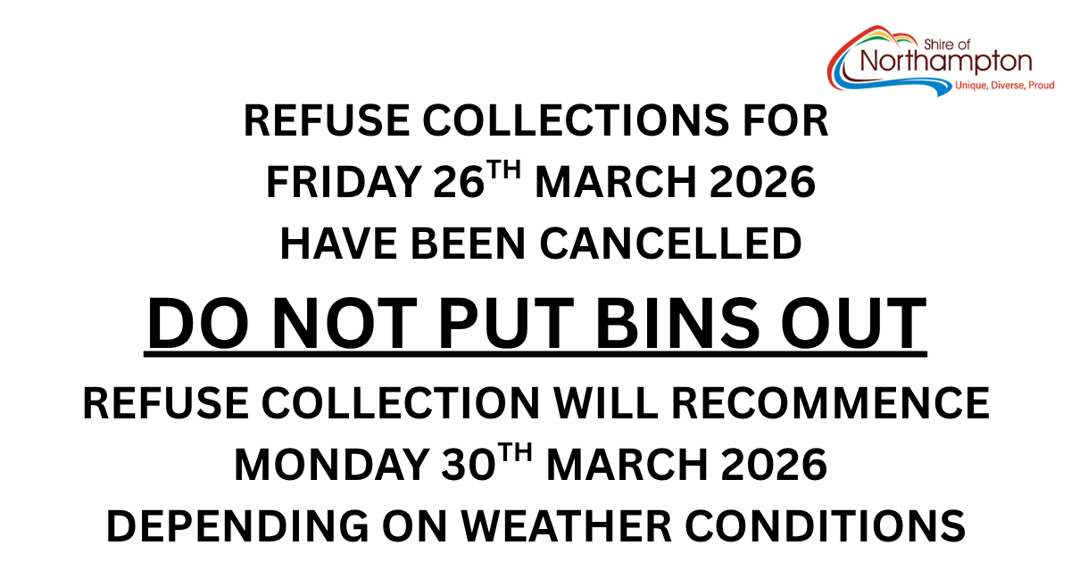 Latest News 26-03-2026 Refuse Collection Services Friday 27th March 2026 Read More 26-03-2026 UPDATE - SEVERE WEATHER IMPACTS FROM TROPICAL CYCLONE NARELLE Read More 25-03-2026 Update - Potential Severe Weather Impacts from Tropical Cyclone Narelle Read More 25-03-2026 Kalbarri and Northampton Refuse Sites - Special Opening Hours Read More 24-03-2026 POTENTIAL SEVERE WEATHER IMPACTS FROM EX TROPICAL CYCLONE NARELLE Read More
