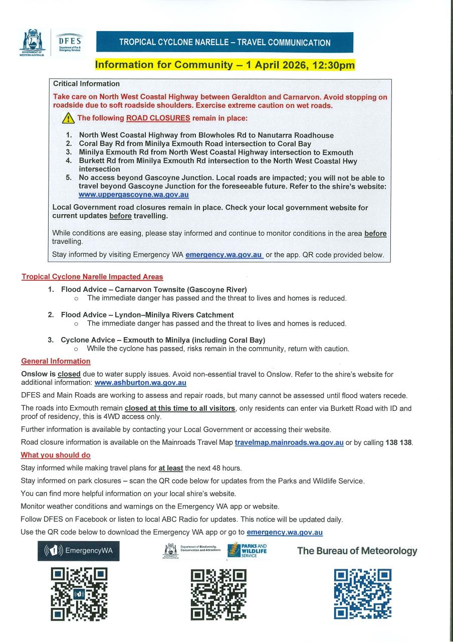 Latest News 02-04-2026 TC Narelle - Travel Information For All Travellers North Read More 31-03-2026 BURNING PROHIBITED EASTER LONG WEEKEND Read More 30-03-2026 Update 6 - Cyclone Narelle - Thank you Read More 30-03-2026 Kalbarri Refuse Collection Services Friday 3rd April 2026 Read More 30-03-2026 Kalbarri Refuse Site - Easter Long Weekend Read More