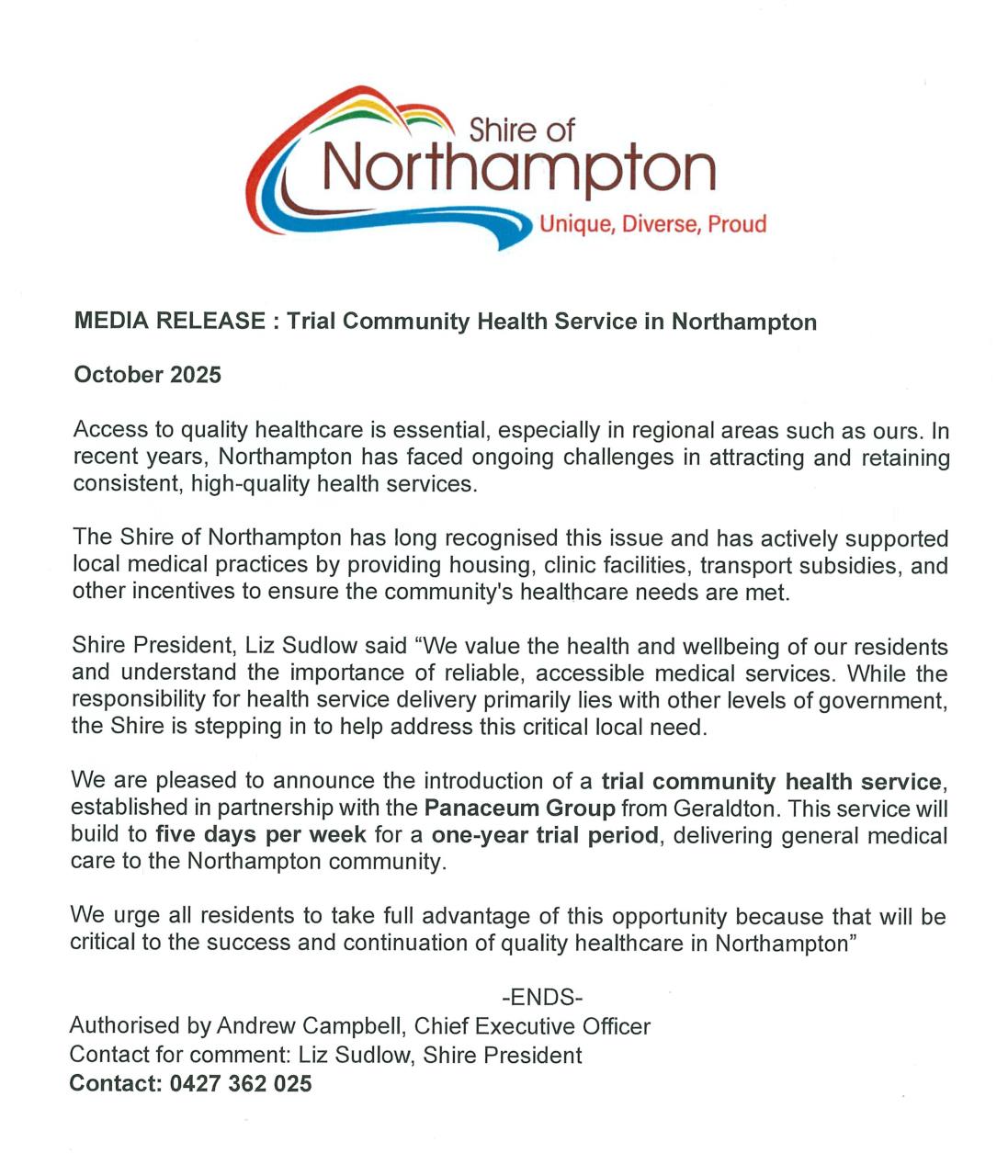 Latest News 18-11-2025 Public Notice - Kalbarri Disaster Recovery Works AGRN965 at Jacques Point Read More 04-11-2025 Booking Doctor's Surgery Northampton Read More 28-10-2025 TRIAL COMMUNITY HEALTH SERVICE IN NORTHAMPTON Read More 24-10-2025 Expressions of Interest - Prospective Lessees - Unit 1 Kitson Circuit, Northampton Read More 23-10-2025 Expressions of Interest - Disposal of Various Office Furniture Items Read More