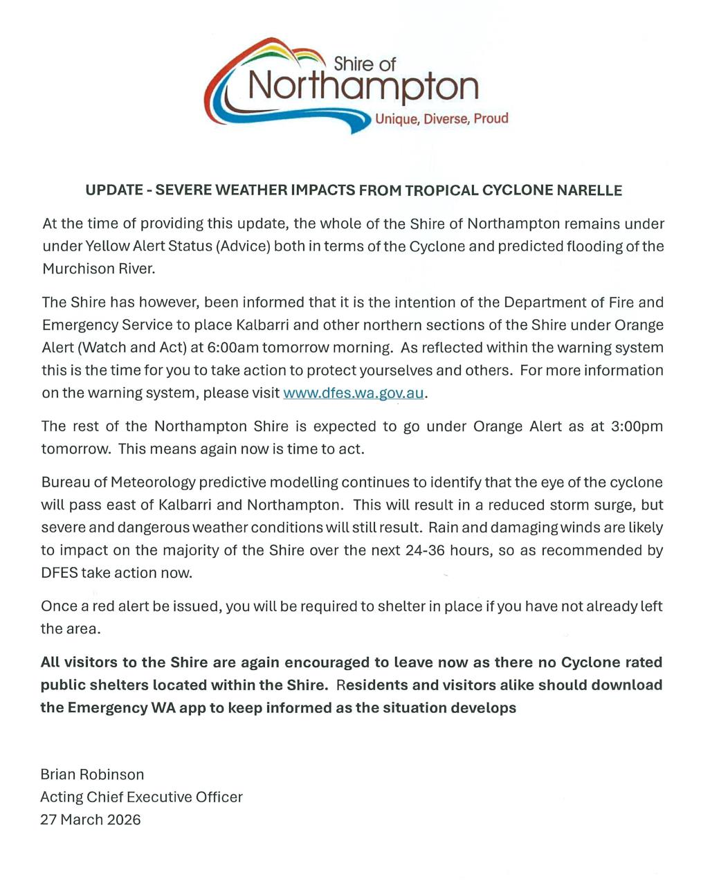 Latest News 26-03-2026 UPDATE 4 - SEVERE WEATHER IMPACTS FROM TROPICAL CYCLONE NARELLE Read More 26-03-2026 Refuse Collection Services Friday 27th March 2026 Read More 26-03-2026 UPDATE 3 - SEVERE WEATHER IMPACTS FROM TROPICAL CYCLONE NARELLE Read More 25-03-2026 UPDATE 2 - SEVERE WEATHER IMPACTS FROM TROPICAL CYCLONE NARELLE Read More 25-03-2026 Kalbarri and Northampton Refuse Sites - Special Opening Hours Read More
